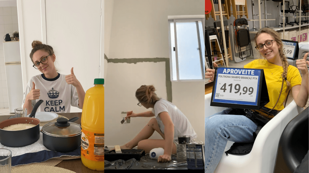 Em mais um perrengue da vida adulta, Jade conta que teve muita dor de cabeça ao adquirir eletrodomésticos usados. O forno do fogão que compraram não funcionava e a geladeira teve que ser trocada pois não era o modelo que tinham visto no site – o que virou seis dias sem o refrigerador. O lado bom dessas experiências é que ela nunca estava sozinha: “Dividir casa com alguém pode ser muito complexo e difícil, mas dou graças a Deus que nós sabemos nos entender, somos ambas responsáveis, maduras e organizadas. Procurei uma roommate e a Gabi, sem sombra de dúvidas, já virou família”.