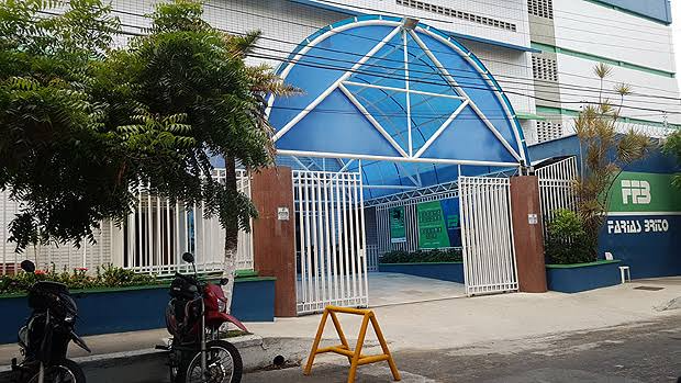 Rigidez no controle na entrada e saída de alunos torna-se urgência nas escolas brasileiras (Foto: Marcel Rizzo/Folhapress) Texto Alternativo: Imagem de fachada escolar. Portão aberto de grades brancas, coberto por toldo semicircular azul. Em frente, duas motos estacionadas, sinalizador de trânsito amarelo ao centro.