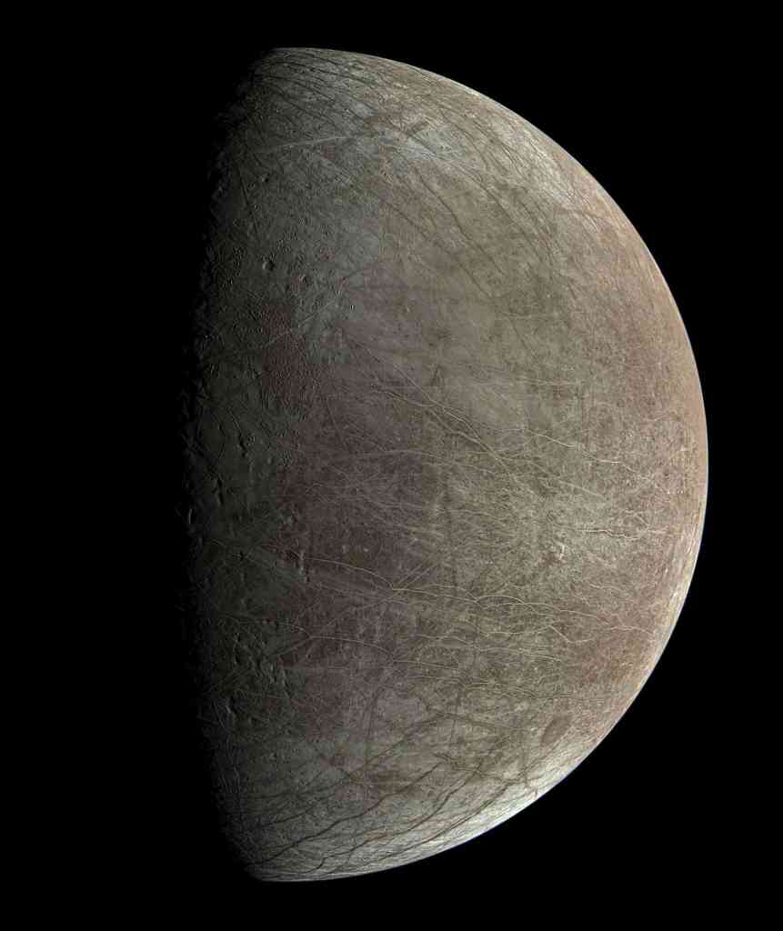 Europa, uma das principais luas gélidas de Júpiter e um dos objetos de estudo da missão JUICE (Foto: NASA/JPL-Caltech/SwRI/MSSS)
