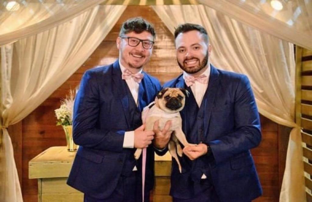 Diego, Felipe e sua cachorrinha Marie, no dia do casamento. Fonte: Arquivo pessoal
