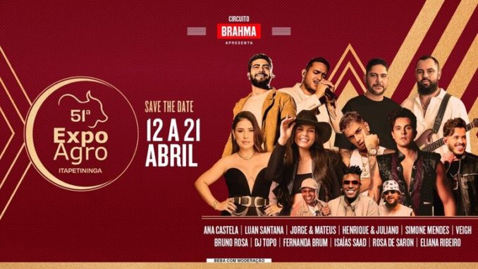 Entre os dias 12 a 21 de abril, Itapetininga recebe pela 51ª vez a Exposição Agropecuária, Industrial e Comercial (ExpoAgro). O evento, com grande tradição na região, promete movimentar uma enorme quantidade de pessoas no sudoeste paulista. Durante todos os dias da exposição, devem ocorrer várias atividades voltadas à esfera agro, muito presente no município. Além disso, esta edição contará com shows de artistas renomados na música brasileira, como Luan Santana e Ana Castela.