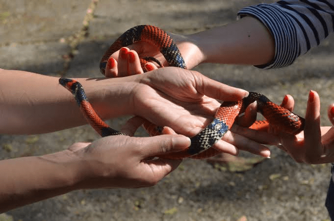 Visitantes podem tocar na pele… ou melhor, na escama de serpentes não venenosas