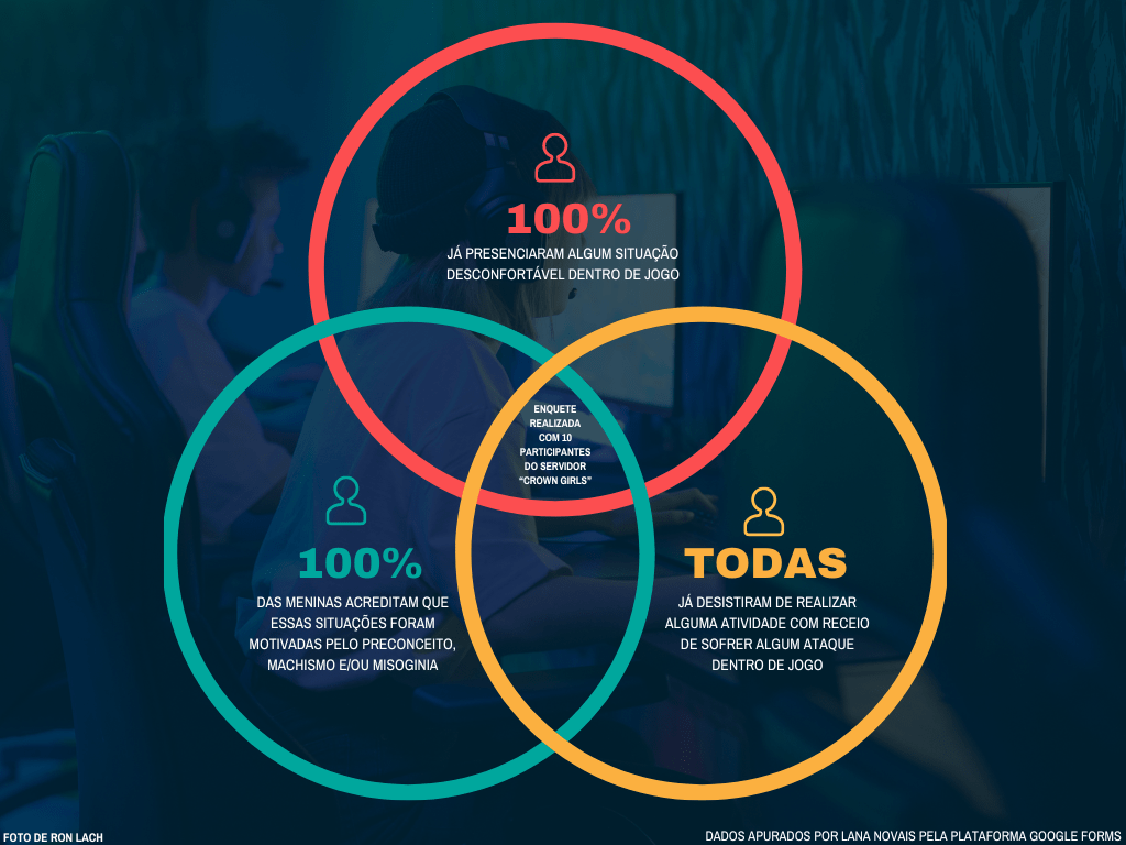 Mesmo online, as mulheres acabam sendo expostas a problemáticas vivenciadas no dia a dia do mundo real. Em uma pesquisa realizada pela Reach3 Insights em parceria com a empresa Lenovo, 59% das mulheres entrevistadas preferem esconder seus nomes ou utilizar identidades masculinas, como forma de evitar o assédio ou o preconceito enquanto jogam.
