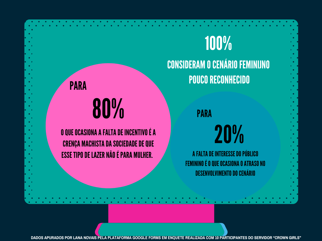 Quando questionadas sobre o cenário competitivo, a enquete realizada com as dez mulheres integrantes do servidor feminino criado por Brenda “Askite” apresenta que para todas, a falta de investimentos faz o cenário ser pouco reconhecido. Já para oito delas, a verdadeira causa da ausência de recursos está na crença machista ainda existente dentro da sociedade, de que esse tipo de lazer/trabalho não é do interesse do público feminino.