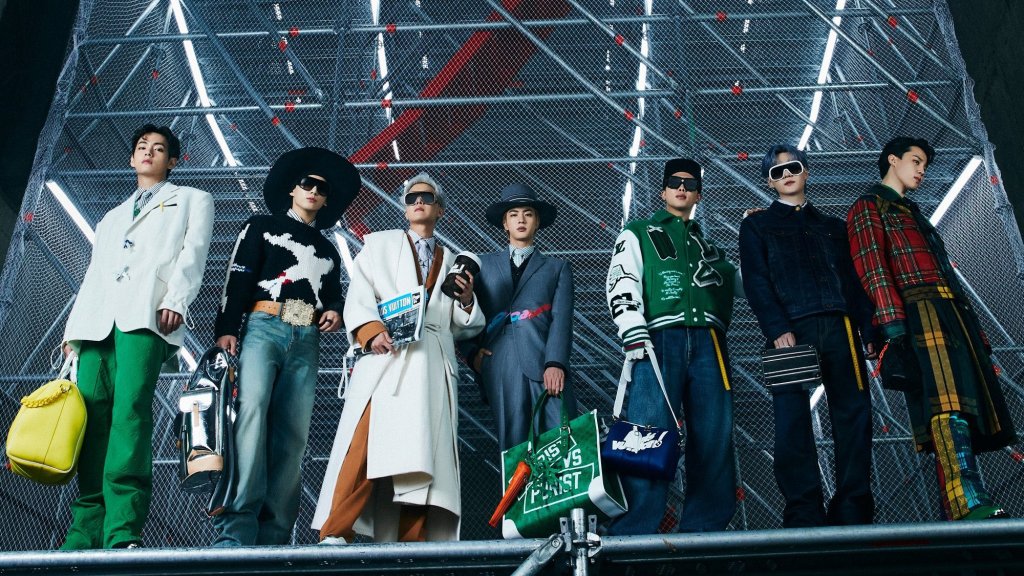 O debut do grupo no mundo da moda aconteceu no desfile da coleção de outono-inverno da Louis Vuitton, em Seul, no ano de 2021. Foto: Reprodução/Twitter.