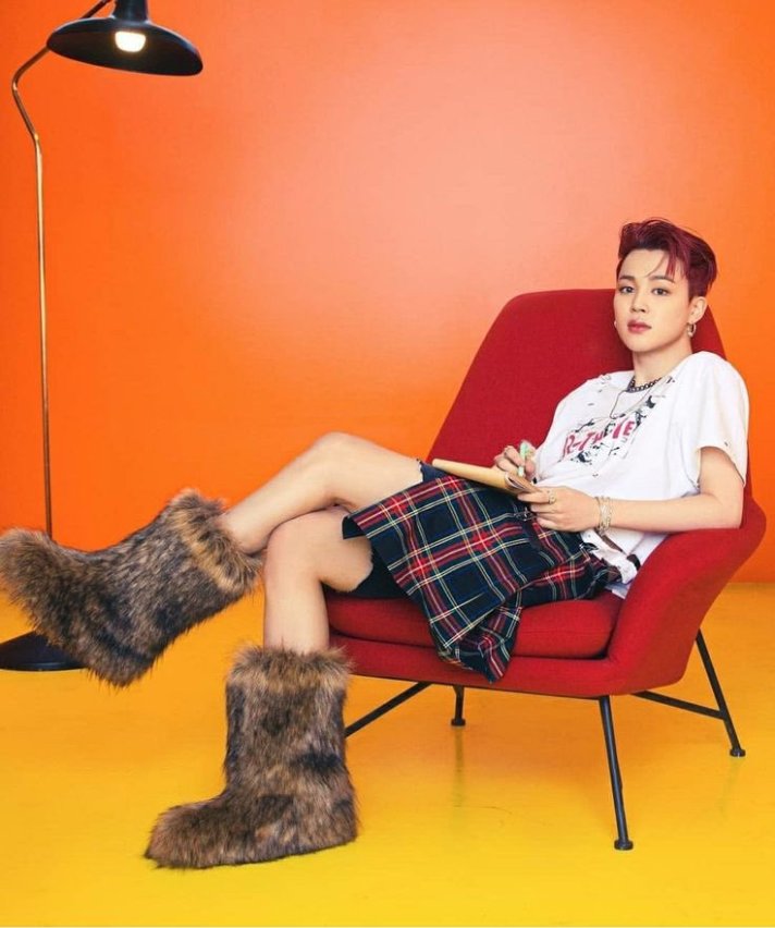Jimin usando saia no ensaio de fotos para o álbum Permission To Dance. Foto: Reprodução/Twitter.