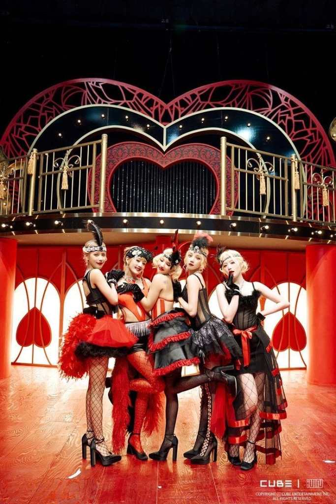 Esquerda: G-IDLE no clipe de ‘Nxde’, de 2022. Direita: Nicole Kidman no filme ‘Moulin Rouge – Amor em Vermelho’, de 2001. Fotos: Cube Entertainment/Reprodução.