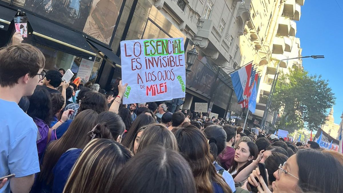 Cartaz diz que “o essencial é invisível para os olhos de Milei; saúde e educação” (foto: Isabella Ortuño)