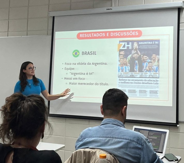 Bauru, 20/08/2024. Na tarde desta quarta-feira (20), durante o XVII Congresso ALAIC 2024, a acadêmica Marcela Soares Evangelista fez sua participação no evento trazendo à tona a utilização das formações discursivas da imprensa argentina e brasileira após a final da Copa do Mundo de 2022.