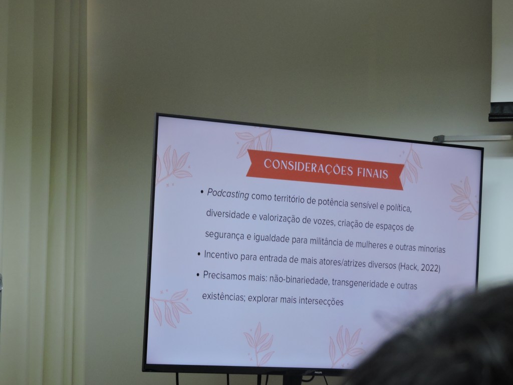 No GI “Comunicação, Empreendedorismo e Inteligência Artificial” um dos assuntos apresentados foi o levantamento dos artigos científicos sobre podcast com perspectivas de gênero em revistas na área de comunicação, pela mestranda em comunicação pela Unesp Daniela Borges de Oliveira que se especializa no assunto de podcasts e mídia sonora.