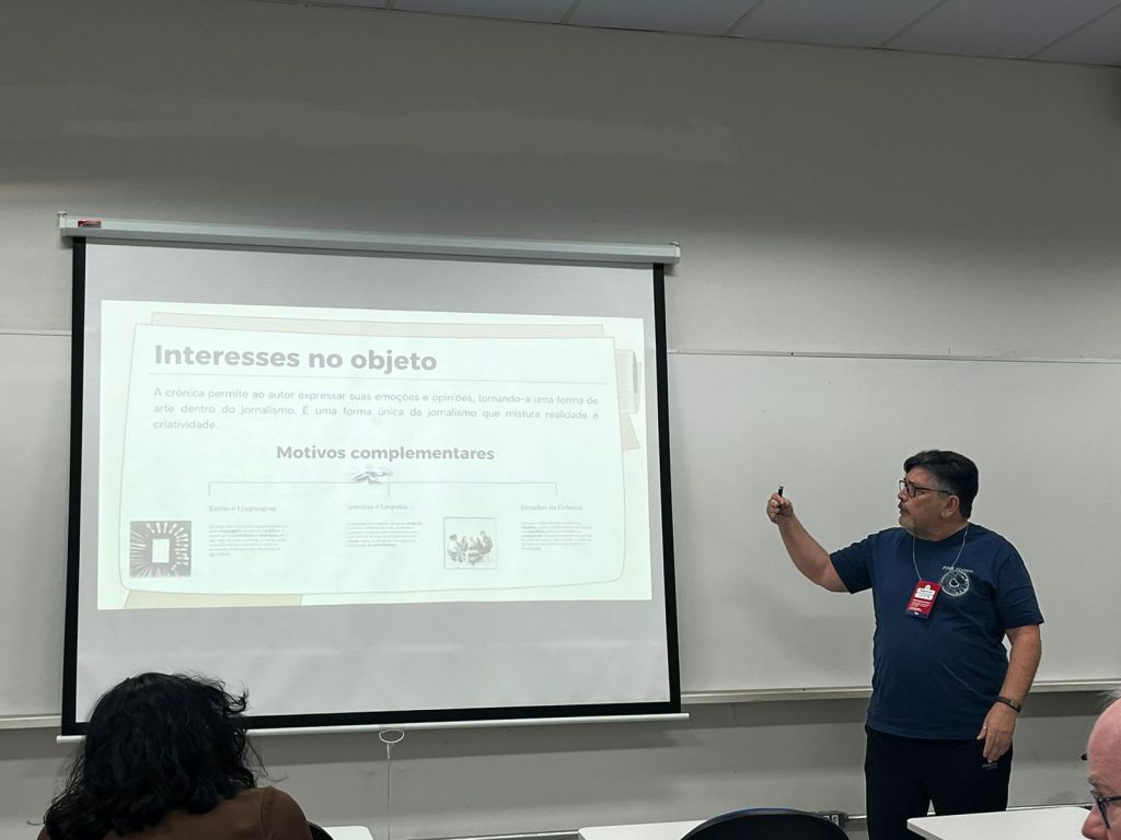 Bauru, 21/08/2024. O segundo dia da 17ª edição da ALAIC (Associação Latino-americana de Pesquisadores em Comunicação) contou com uma vasta programação dos Grupos de Interesse (GI’s) e Grupos Temáticos (GT’s) na tarde desta quarta-feira, dia 21 de agosto. O GT “Estudos de Periodismo” propôs em uma de suas sessões o tema “Reflexões, conceitos e gêneros no periodismo”, onde o docente da Universidade Federal de Juiz de Fora (UFJF), Boanerges Lopes, expôs seu novo projeto de pesquisa intitulado “O lugar da crônica no jornalismo contemporâneo: fracasso dos gêneros ou laboratório de experimentações?”.