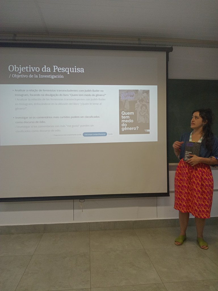 Isabella iniciou sua apresentação dizendo: “nosso principal objetivo com essa pesquisa foi analisar a relação de feministas transexcludentes com Judith Butler no Instagram, focando na divulgação do livro “Quem tem medo do gênero?”.