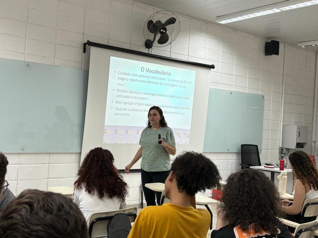 No dia 25 de setembro, durante a Semana de jornalismo de 2024, a professora doutora Vivianne Lindsay Cardoso, do departamento de Comunicação Social ministrou a oficina de Oratória: a arte de falar em público.