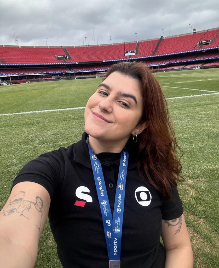 Tayna Fiori durante cobertura da final do Brasileirão Feminino 2024 (Reprodução/Redes sociais: taynafiori)