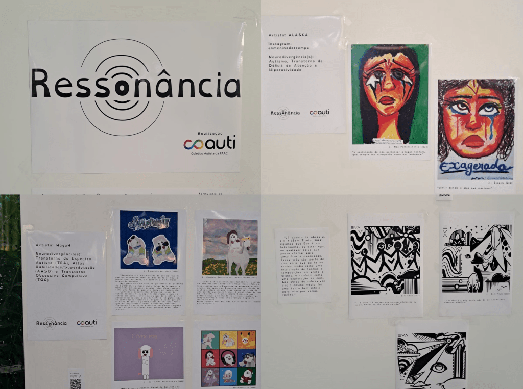 A programação também teve destaque no espaço acadêmico. Na Unesp (Universidade Estadual Paulista Júlio de Mesquita Filho) de Bauru, ocorreu a exposição “Ressonância”, desenvolvida pelo CoAuti (Coletivo Autista da FAAC) e disponibilizada na biblioteca do campus. Foram expostas produções de 10 artistas neurodivergentes, junto a um breve texto que contextualiza as obras. “A ideia da exposição é divulgar não só a arte de artistas neurodivergentes, mas também o ponto de vista deles. Do lado das artes tem um texto que o próprio artista escreveu explicando o processo, o que ele estava pensando na hora”, explica Beatriz Haddad Ordones, fundadora e membro do CoAuti.