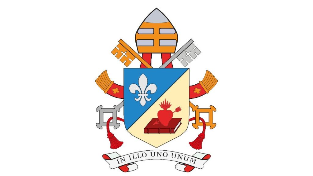 Já o brasão e o lema escolhidos pelo Santo Padre permanecem o de sua consagração episcopal. O livro com o coração transpassado remete à ordem agostiniana bem como a frase “In Illo uno unum“, palavras de Santo Agostinho que significam: “embora cristãos sejamos muitos, no único Cristo somos um”.