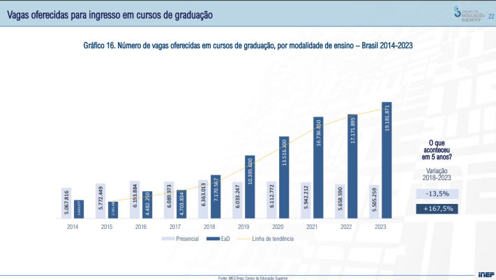 A categoria vem apresentando crescimento exponencial nos últimos anos. Segundo dados do Censo da Educação Superior (2024) entre 2018 e 2023 houve um aumento de 232% das vagas ofertadas, totalizando 19 milhões de novas vagas oferecidas pelo sistema privado, e apenas 134 mil ofertadas pelo sistema público (incluindo-se aí, federais, estaduais e municipais).
