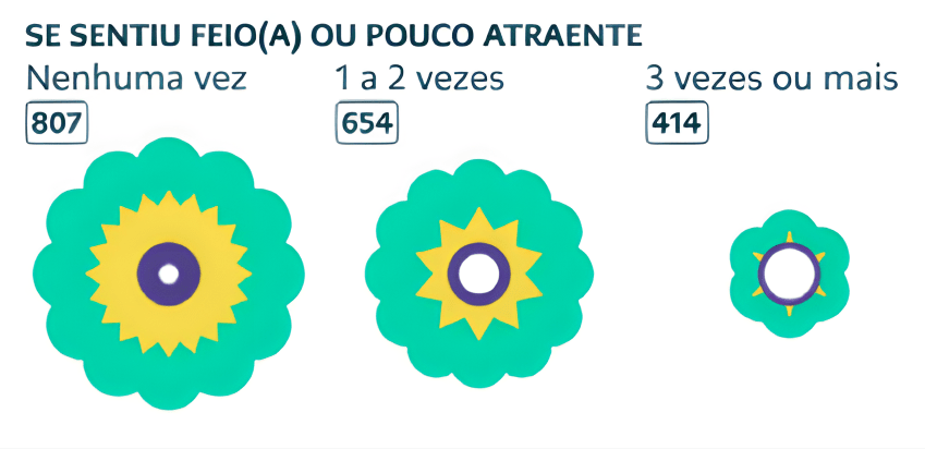 Também foram apontados atributos como celulite e estrias, cicatrizes e manchas, altura, pelos, sobrancelhas, tamanho das orelhas e marcas de envelhecimento. Inseguranças associadas ao peso e à barriga foram comentadas em 58% das respostas.