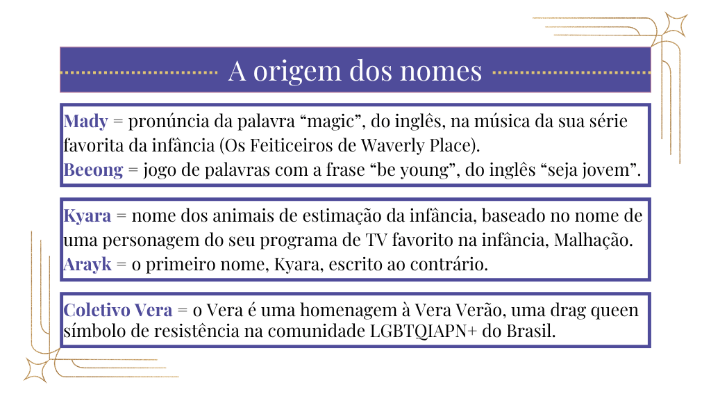Mady Beeong, artista drag queen, encontrou uma forma de se expressar por meio da arte após vivenciar uma juventude de restrição. “Sempre fui muito reprimido pela minha família. Já até fui obrigado a entrar em um colégio militar, rasparam minha cabeça. Mas eu sempre soube que eu tinha essa veia artística e queria trabalhar com isso. Foi quando eu consegui minha liberdade.Tudo que eu reprimi… aflorou”, contou ela.