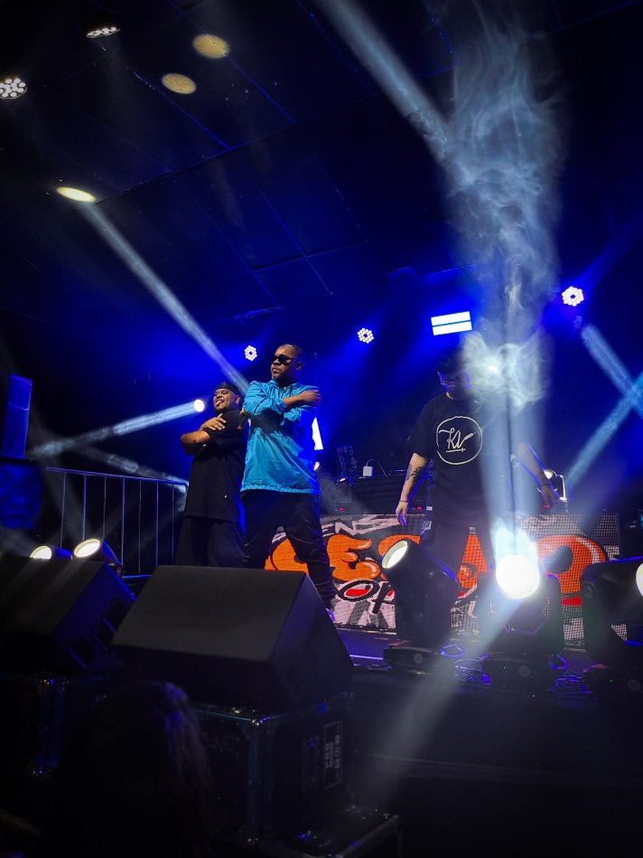 Acompanhando o rapper no palco e mantendo a energia arrebatadora do show, estavam os dançarinos Denão e Mavi e o DJ Batata Killa. Sobre sua relação profissional com esses artistas mais novos na cena, Xis reflete: “A minha relação é mais de parceria com MC, com DJ, o pessoal que cola comigo. A Mavi, por exemplo, vai fazer 20 anos amanhã (20). O Denão e o Batata Killa são caras novos também, que estão ali com seus 30 anos de idade”. No palco, o quarteto vive uma química inimitável, que é visivelmente fruto de uma compreensão profunda não só do catálogo, mas da artisticidade de Xis.