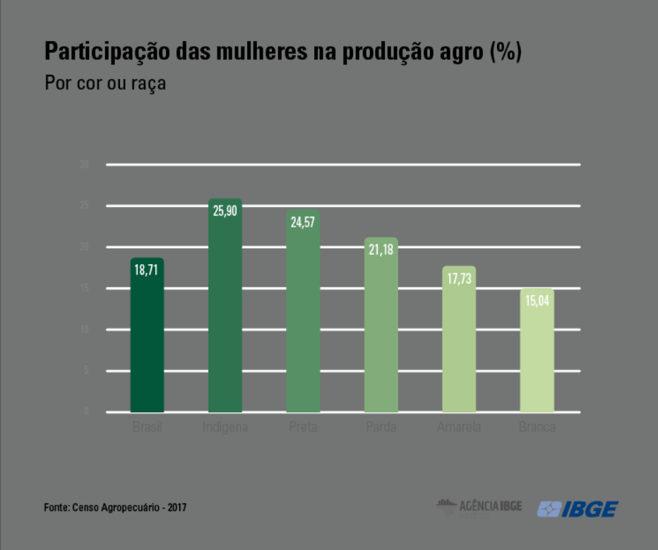 Em dados publicados através do Censo Agro 2017, realizado pelo Instituto Brasileiro de Geografia e Estatística (IBGE), os territórios administrados por povos indígenas têm a produção agrícola mais diversificada (43,24% classificados como diversificados e muito diversificados) e com menos agrotóxicos. Além disso, a participação das mulheres possui taxas elevadas nas produções realizadas por indígenas (com participação de 25,90% das mulheres), seguido das produções de pessoas pretas (com 24,57% das mulheres atuantes na agricultura).