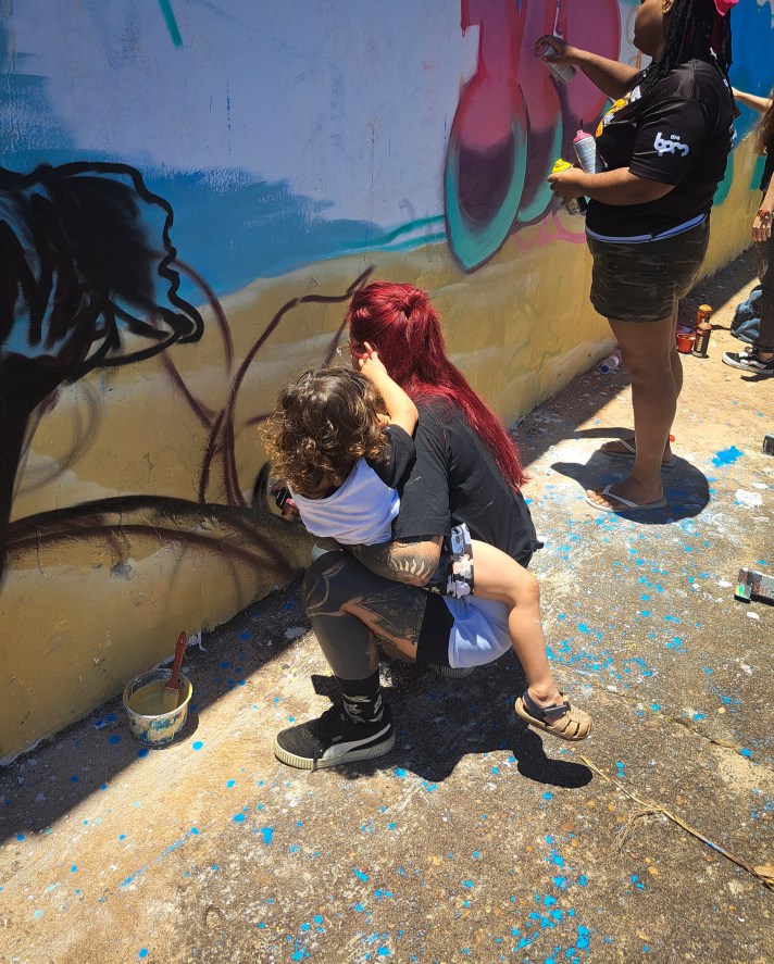 Gaúcha, como o nome artístico sugere, veio de Porto Alegre, no Rio Grande do Sul, e enfrenta um desafio diferente do que se vê por aí: o de ser mãe e grafiteira. Durante o “Cada CEP Uma Tag”, seu filho Baruc, de três anos, corria entre as latas de spray e interagia com todos os outros artistas presentes. Gaúcha comenta como é trabalhar neste ambiente e cumprir tantas funções simultaneamente: “É um desafio dobrado, porque a maternidade já é um trabalho, então tem que conciliar. Eu já grafitava antes de ter ele, faz dez anos que eu faço graffiti. Grafitei grávida, e depois que ele nasceu eu comecei a levar ele junto também. Não tem como dividir as duas realidades, é um aprendizado. Com ele junto, a arte tem outro ritmo”.