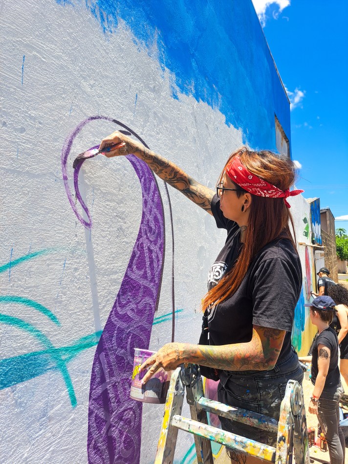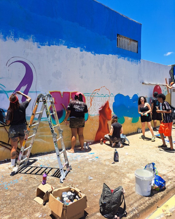 No “Cada CEP Uma Tag”, os grafiteiros começaram pintando uma ilha como plano de fundo do muro localizado na rua Virgínia Degasperi Pereira, no bairro Nobuji Nagasawa. O cenário litorâneo foi, aos poucos, ganhando novas cores e formas, com o olhar específico de cada artista que deixava seu toque no mural. Pingos de tinta, escadas e caixas com sprays ocupavam a calçada enquanto os artistas alternavam as alturas de onde coloriam o espaço. Entre os criadores presentes, estavam Mari Monteiro e Gaúcha, duas artistas já consolidadas na cena e que vivem da sua carreira no graffiti, mas enxergam sua arte a partir de lugares totalmente diferentes.