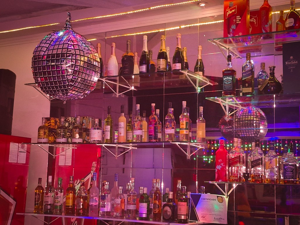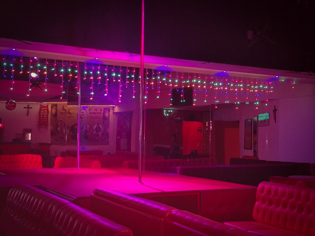 Na entrada da casa noturna, carpete vermelho e paredes decoradas com fotos de mulheres posando. No batente de cada portal, cortinas de luzes coloridas. No interior, mesa de sinuca, barra para pole dance, o bar e um mar de bancos de veludo vermelho. Nos bancos, homens jovens, homens mais velhos, homens debruçados sobre alguma mulher. Uma cruz pendurada ao lado do palco.