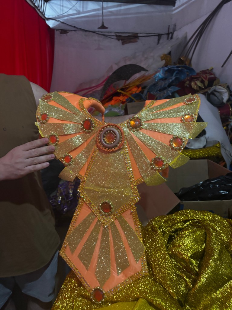 Fantasias antigas e estruturas dos carros alegóricos reutilizadas. Fotos: Acervo pessoal